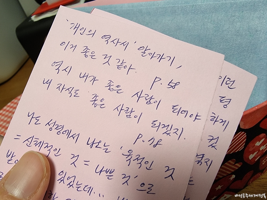 그리고 책 사이 사이 인상적이었던 부분을 별도의 메모지에 기록해 두었습니다.