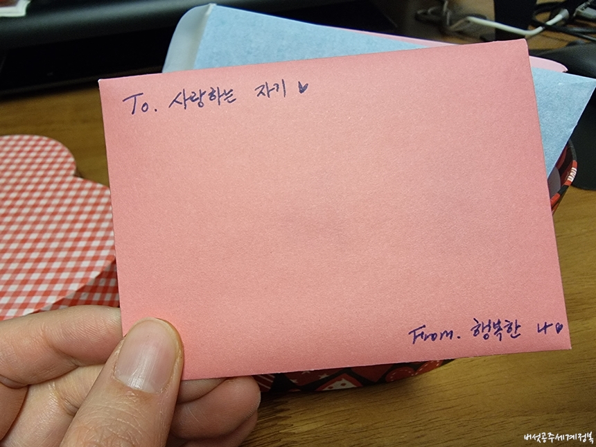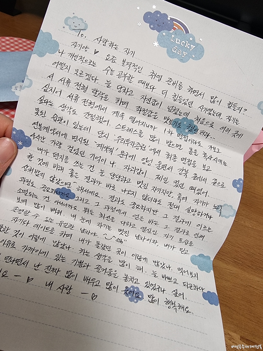 그리고 정성스레 손편지를 써 내려 갔죠. 몇 번이나 오탈자가 있는지 확인하고, 사랑글귀와 하트이모티콘도 빼먹지 않았습니다.