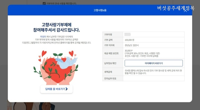 기부금은 지방세법에 따라 기부금으로 인정되며, 연말정산 시 공제받을 수 있습니다. 기부한 자치단체는 기부자의 정보를 비공개로 처리한다고 합니다.