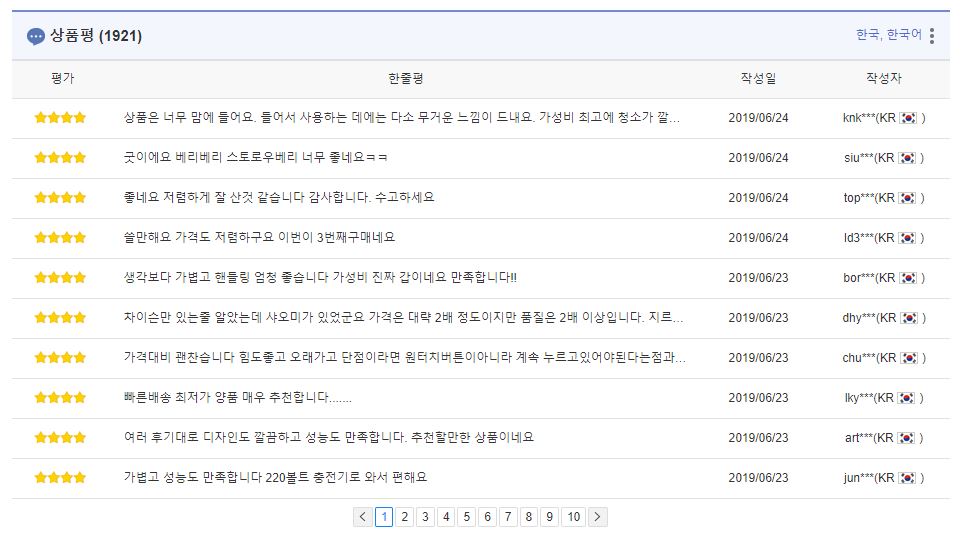 상품평은 1921개로 10페이지 이상 쭉 넘기면서 후기를 봤는데