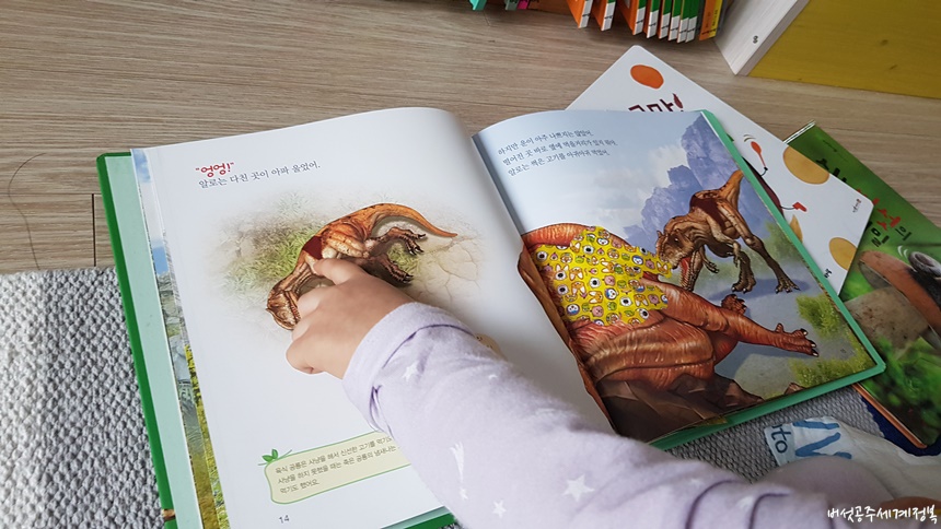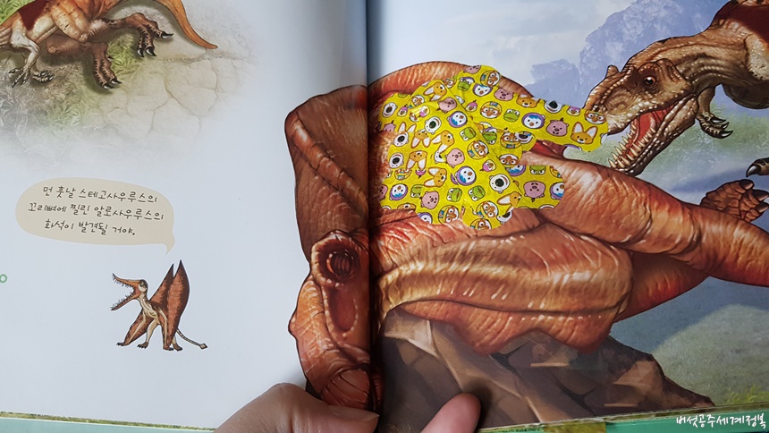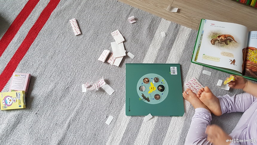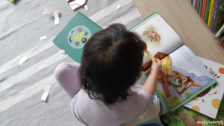 행복이는 책 속에 있는 알로사우르가 다쳐서 피가 나서 밴드를 붙여줬다고 설명해 줬다.