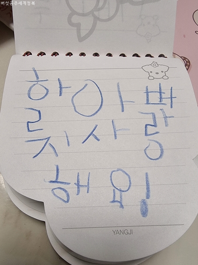 사랑을 충분히 받고 자란 아이는 사랑을 베풀 줄 안다. 수첩 여기저기 '사랑해요' '좋아해요'라는 글귀가 많고 그림마다 '하트'가 많은 이유. 자신이 부모로부터 얼마나 많을 사랑을 받는지 잘 알고 있기 때문에. 자신의 사랑을 타인에게 표현하는데 어려움이 없는 것이다. 이 수첩을 보며 둘째의 넘치는 사랑이 어디에서 비롯되었는지 알 수 있었고, 한편으로는 첫째에게도 더 많은 관심과 사랑을 쏟아야겠다는 생각이 들었다.