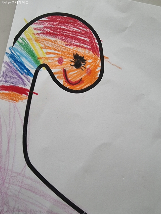 자기 자신에 대해 그림을 그리라고 했는데, 너무 표정이 없는 얼굴이 그려져 있었다. 또래의 다른 아이들은 해맑게 웃고 있는 자신의 얼굴을 그린 반면, 우리 아이만 표정이 없고 색상 또한 칙칙한 것을 보고 크게 충격을 받아 그 뒤로, 신랑에게 이야기를 해서 아이에게 적극적으로 사랑한다는 표현을 많이 하고 다독였다. 아이를 키우면서 아이가 어떤 그림을 그리는지 어떻게 색칠하고 표현하는 지를 보면 아이의 심리 상태를 가늠할 수 있는 듯하다.