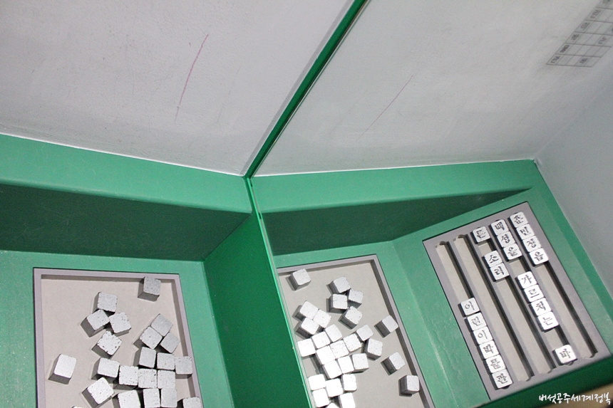 활자를 글자판에 맞춰 보는 놀이입니다. 꽤나 단순한 놀이인데 거울을 보며 반대로 비친 모습을 확인해 가며 맞춰 보는 건데 퍼즐이나 레고를 즐겨하는 시기라 그런지 집중해서 완성해 내는 모습이 대견했습니다.