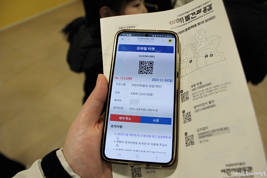 예약 취소 없이 회차 시작 후 30분까지 입장하지 않는 고객은 예약 부도일로부터 60일간 어린이박물관 관람이 제한되며, 관람제한 기간의 모든 예약이 취소됩니다. 현장 발권은 불가능하며, 어린이박물관 입구에서 모바일 티켓 확인 후 입장하실 수 있습니다. 어린이를 동반하지 않은 관람객이나 성인 보호자를 동반하지 않은 어린이의 입장을 제한하고 있습니다. 36개월 미만 유아도 예약해야 입장이 가능합니다. 이러나 저러나 예약은 필수!
