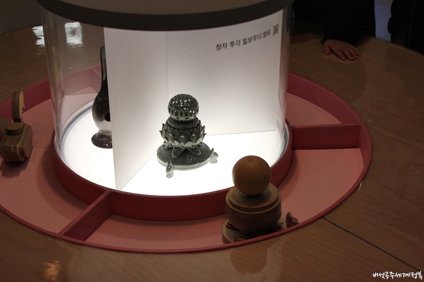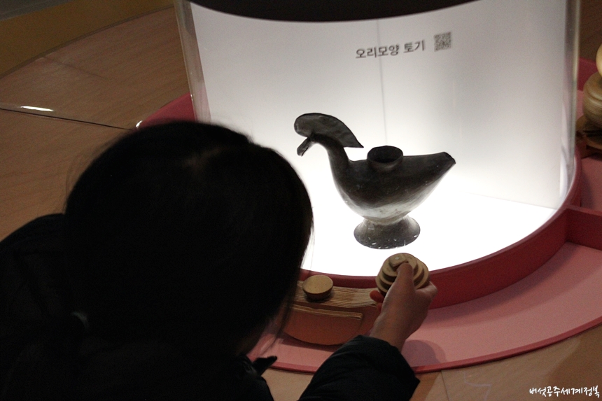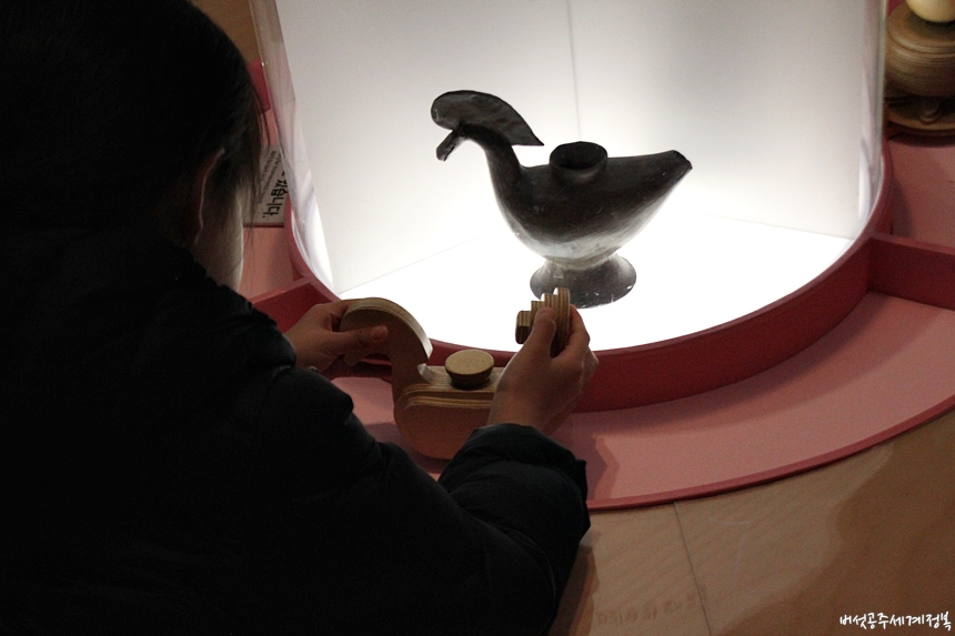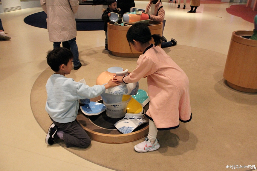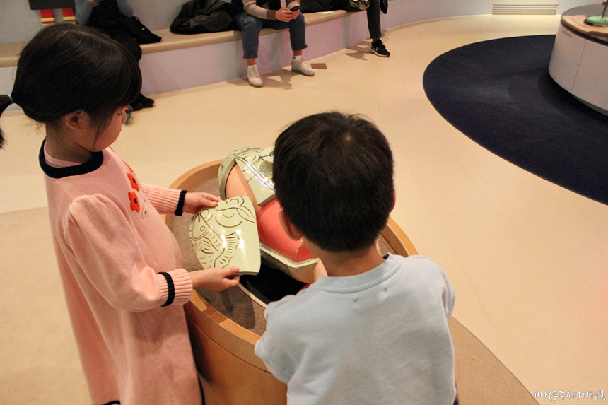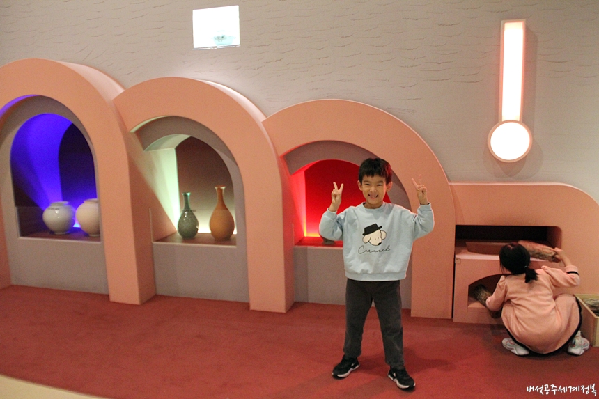 둘째는 열심히 뒤에서 가마에 나무를 넣으며 불을 때우고, 첫째는 그 앞에서 사진을 찍었네요. 장작을 넣음에 따라 불의 밝기가 더 거세지고 화도에 따라 나오는 도자기가 다르다는 부분을 도자기가 놓여 있는 위치에 조명이 켜지는 것을 보고 알 수 있더라고요. 아이들이 유치원에서 그리고 학교에서 도자기를 구워 봤다는 이야기를 하며 잔뜩 신이 났습니다. 이미 경험한 바를 이렇게 박물관에서 또 보니 더 즐거워 한 것 같아요.