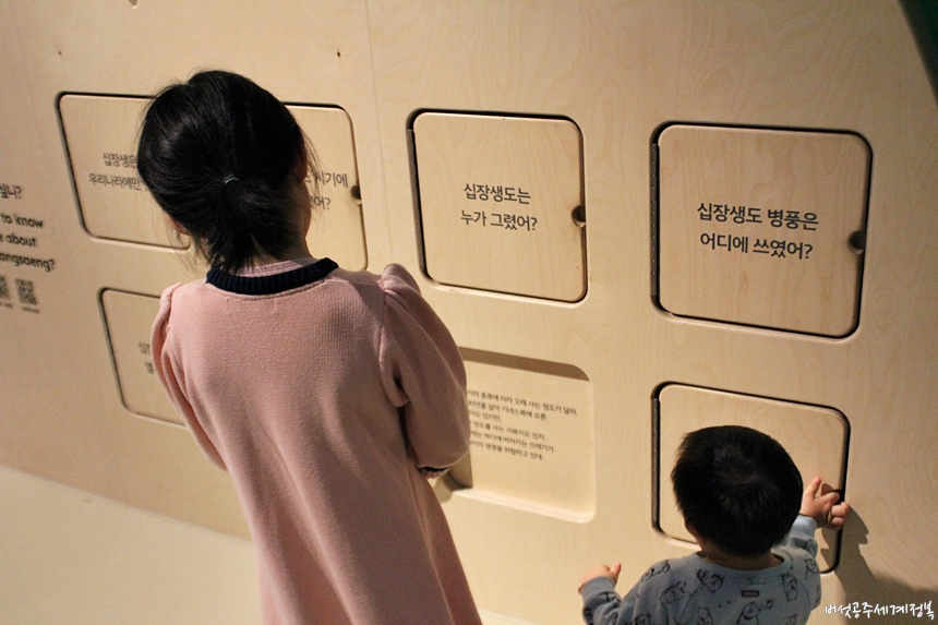 십장생을 바로 읊어 보세요- 라면 잠시 멈칫 하며 읊게 되는데 오늘 어린이박물관 특별전에서 십장생에 대해 확실히 이해할 수 있게 되었습니다. 십장생은 <해, 구름, 산, 물, 소나무, 바위, 불로초(영지버섯), 학, 거북이, 사슴> 입니다.