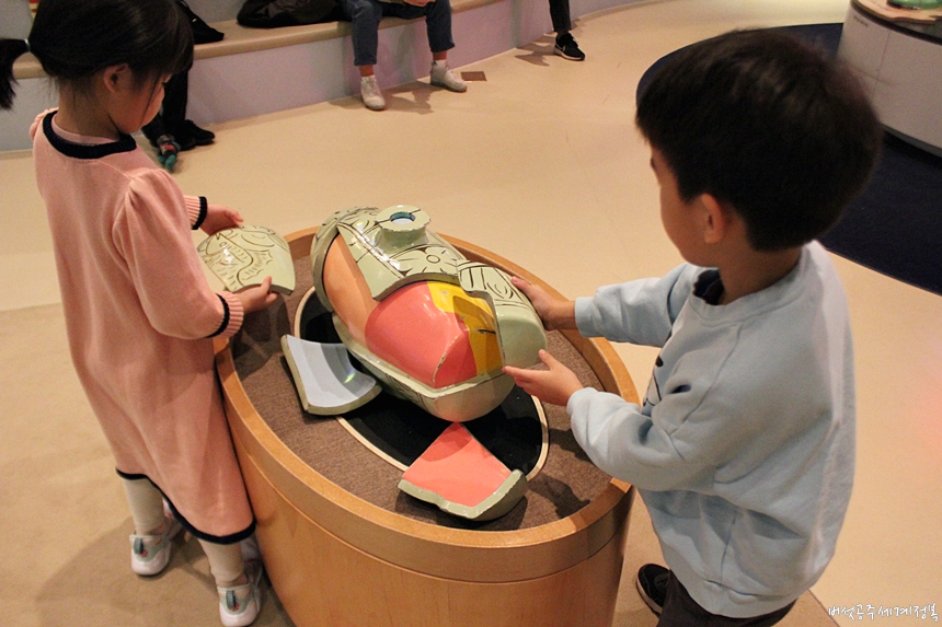 어린이박물관을 처음 입장했을 때에는 생각했던 것보다 규모가 그리 크지 않다는 생각을 했어요. 그럼에도 불구하고 공간 활용을 너무나 잘 했고, 곳곳에 배치된 아이들이 좋아하는 체험 가능한 전시품이 많다 보니 1시간 20분이라는 시간을 알차게 가득 가득 채우고 나왔답니다.