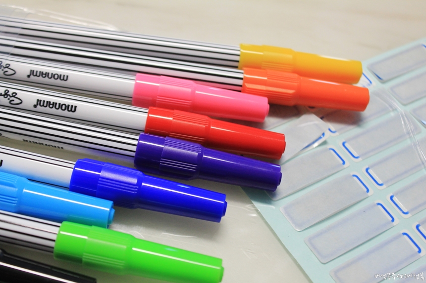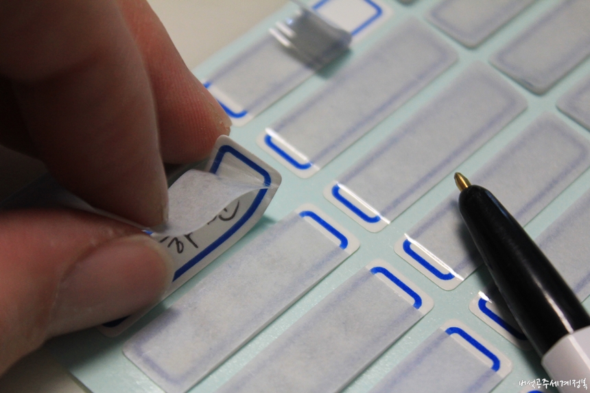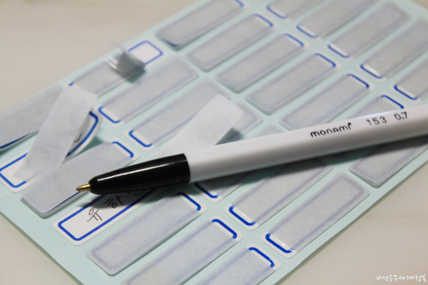 전 올드한 스타일, 아날로그 스타일을 워낙 좋아하는지라 ㅎㅎㅎ 그저 문구점에서 파는 견출지에 썼어요. 어렸을 적, 어머니, 아버지가 신학기마다 이름을 예쁘게 써서 제 물건에 붙여 주셨었는데 그 기억이 성인이 된 지금까지도 너무 좋게 남아 있답니다.
