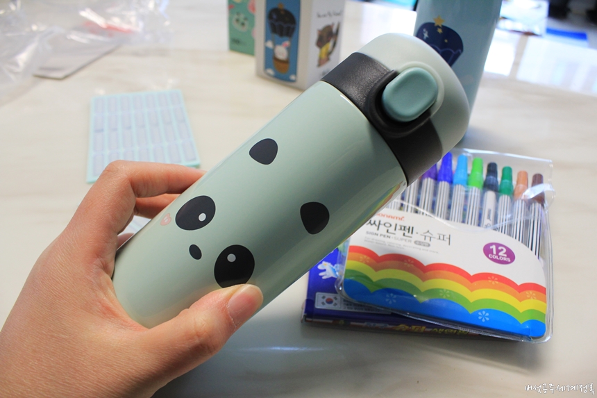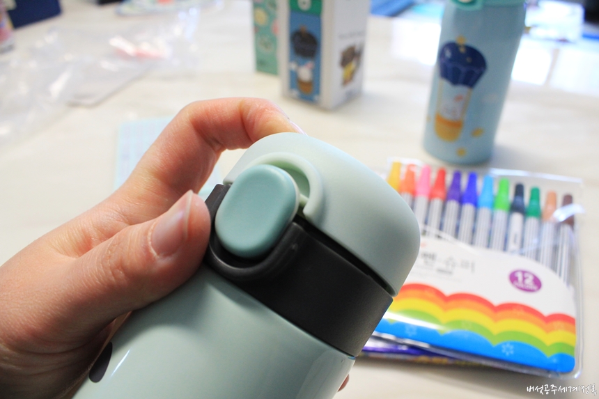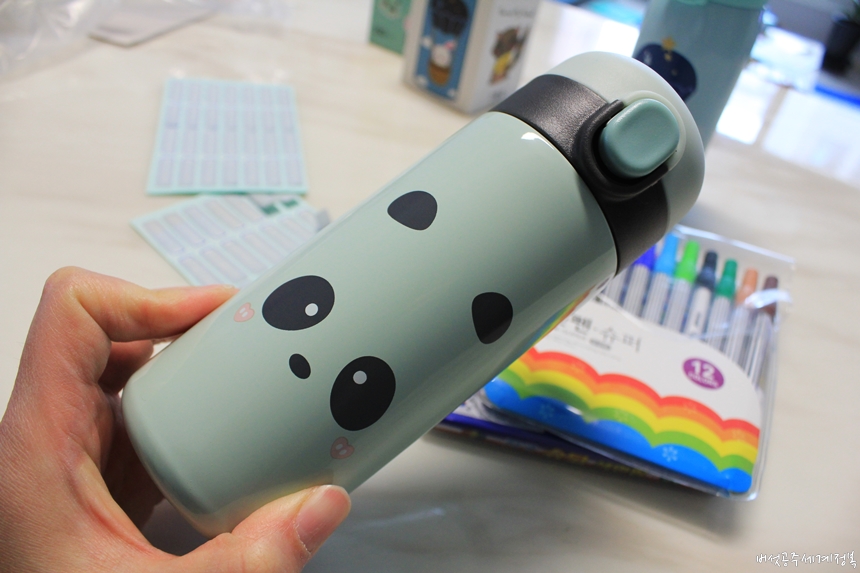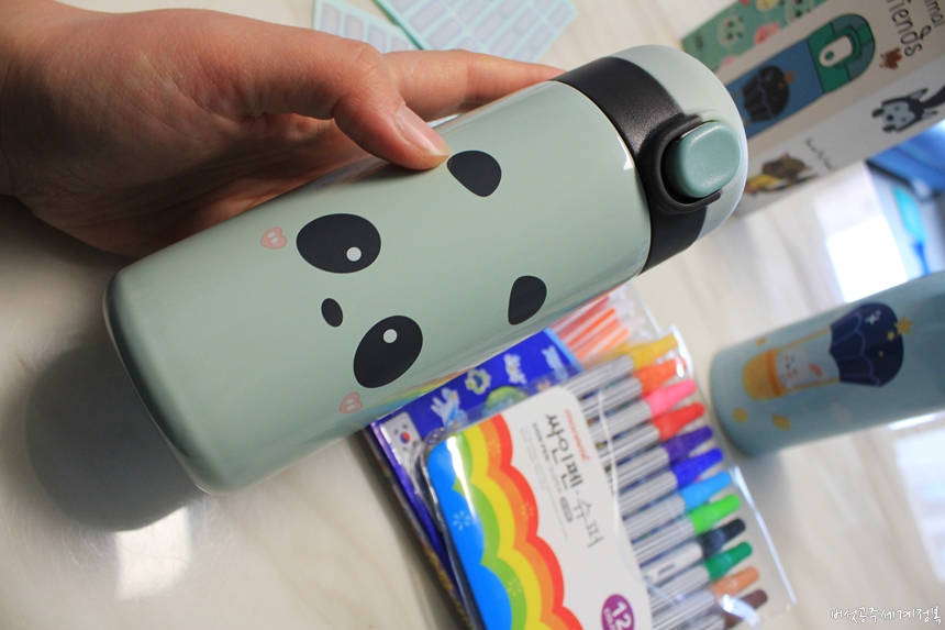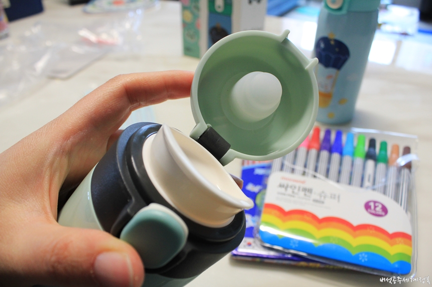 어린이집에 다니는 딸과 유치원에 다니는 아들 모두에게 원터치 물병을 넣어줬어요. 두 손으로 야무지게 잘 잡고 마시더라구요. 종일반 과정에 있는지라, 아무래도 장시간 있다 보니 350ml 사이즈가 나을 것 같아 좀 더 큰 사이즈로 준비했어요.