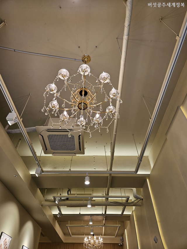 핵밥다이닝 내부로 들어서니 천장의 화려한 샹들리에 조명이 눈에 띄었고 전체적으로 깔끔한 분위기였습니다.
