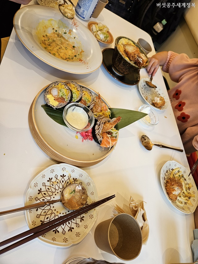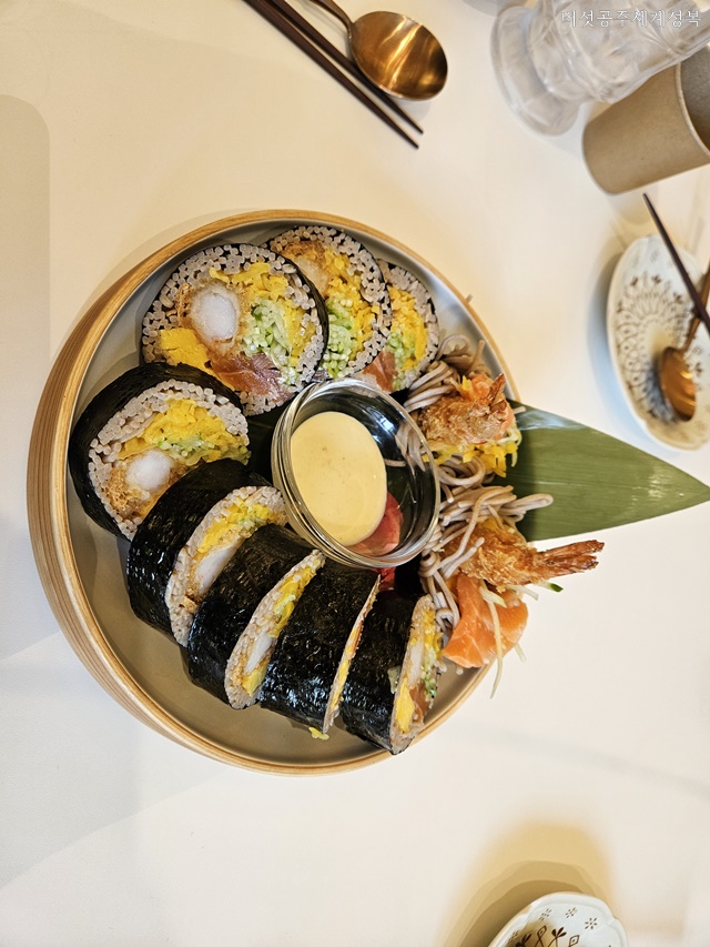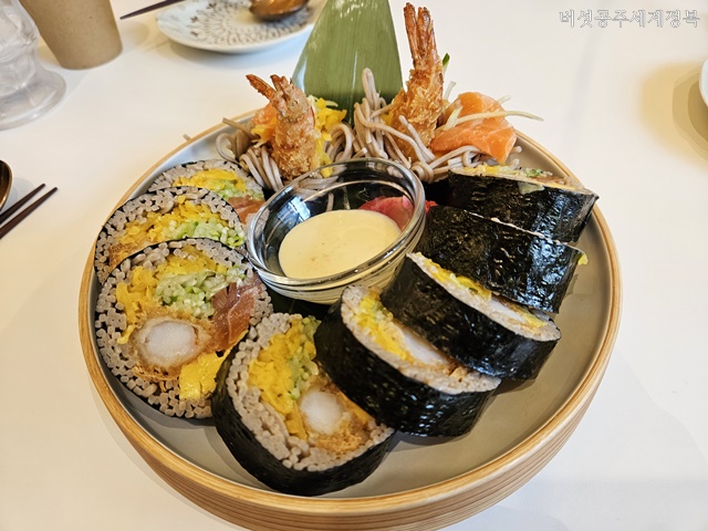 자세를 고쳐 앉기 시작한 건, 바로 메밀후토마끼가 등장하면서부터인데요. 상당히 생소하고 먹어본 적 없는 메뉴라 어떨지 궁금해하며 먹어봤어요. 두 아이에겐 잠시 기다려 달라고 말하고 (아무래도 날 것인 연어가 들어가 있으니 말이죠) 엄마, 아빠부터 허겁지겁 먹기 시작한 건 비밀 아닌 안 비밀.
