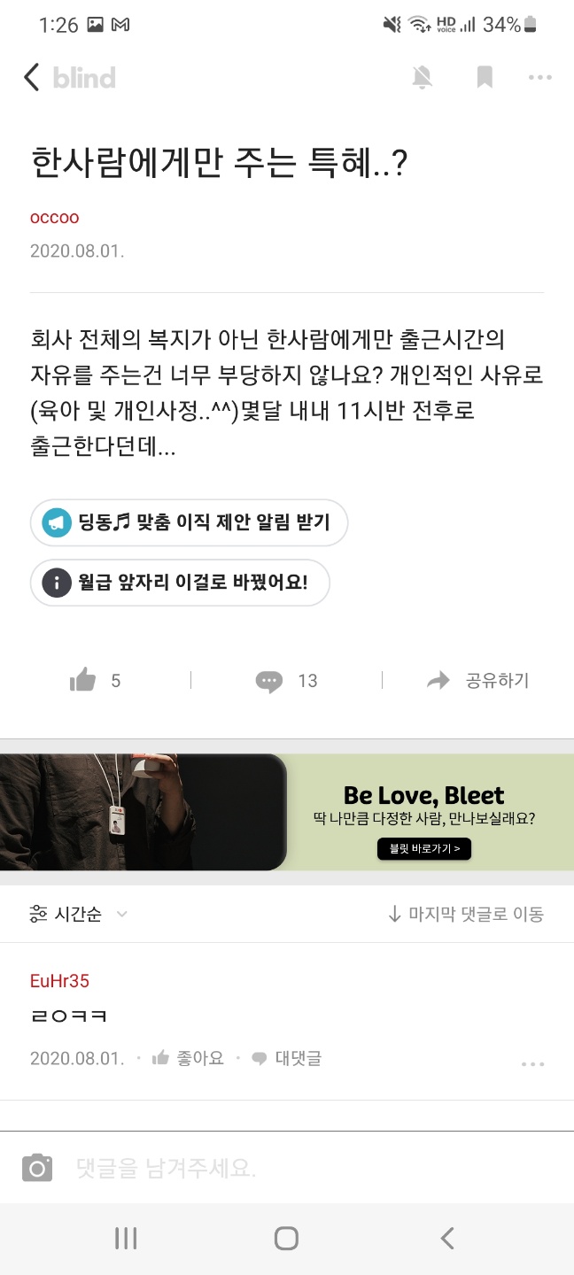 제 업무와 관련된 담당자들에게 개인 사정으로 오전 9시~10시 사이 출근 가능할 것 같으며 업무상 문제되지 않도록 신경쓰겠다는 이야기를 했었죠. 그런데 한 달 정도 지난 시점, 익명 온라인 커뮤니티 앱인 블라인드 게시글에 저에 대한 이야기가 올라왔다는 이야기를 건네 듣고 블라인드 메일 인증 후, 어떤 내용이 올라왔는지 읽어 보았습니다.