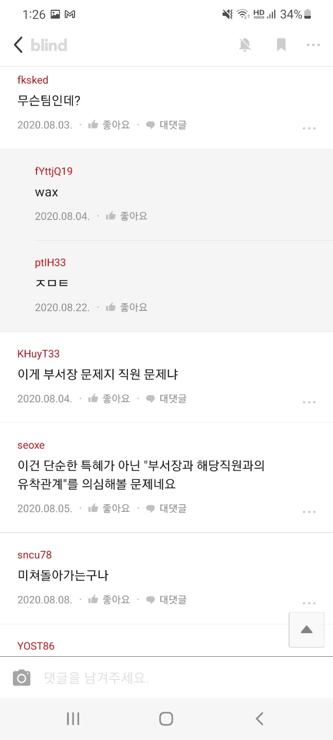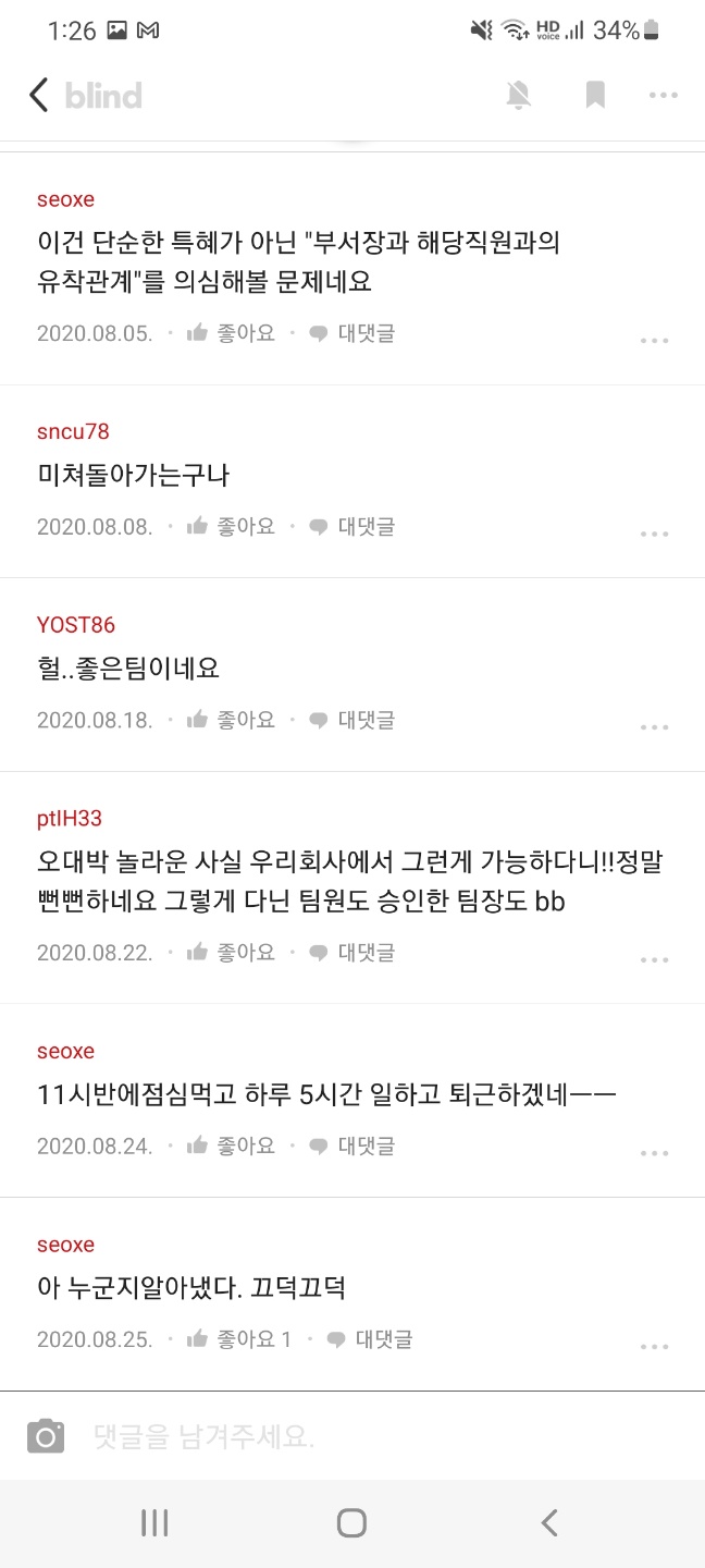 궁금해서 작성자가 누군지, 댓글을 단 사람이 누군지 역추적 하기 시작했습니다. 블라인드 앱이 익명을 보장한다고는 하나, 앞서 기재된 작성자명은 이전에 작성된 글(동일한 아이디로 작성한 게시글이나 댓글)을 기반으로 누구인지 충분히 유추가 가능하더군요.