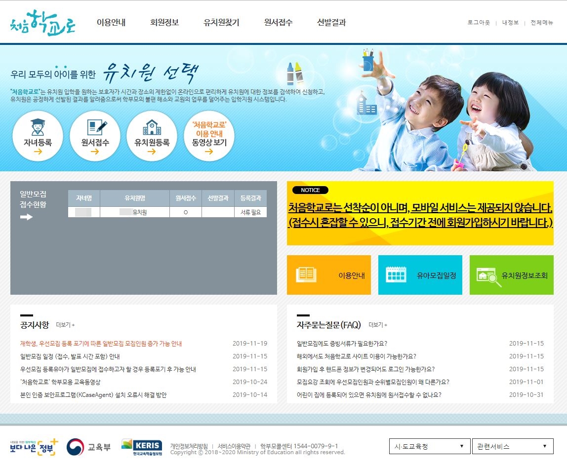처음학교로 우선접수는 끝난 상태고 오늘이 처음학교로 일반접수 첫째날이다. 처음학교로는 선착순이 아니며, 모바일 서비스는 제공되지 않는다. 접수시 혼잡이 예상되어 미리 회원가입을 해두었기에 좀 더 수월하게 접수 할 수 있었다.