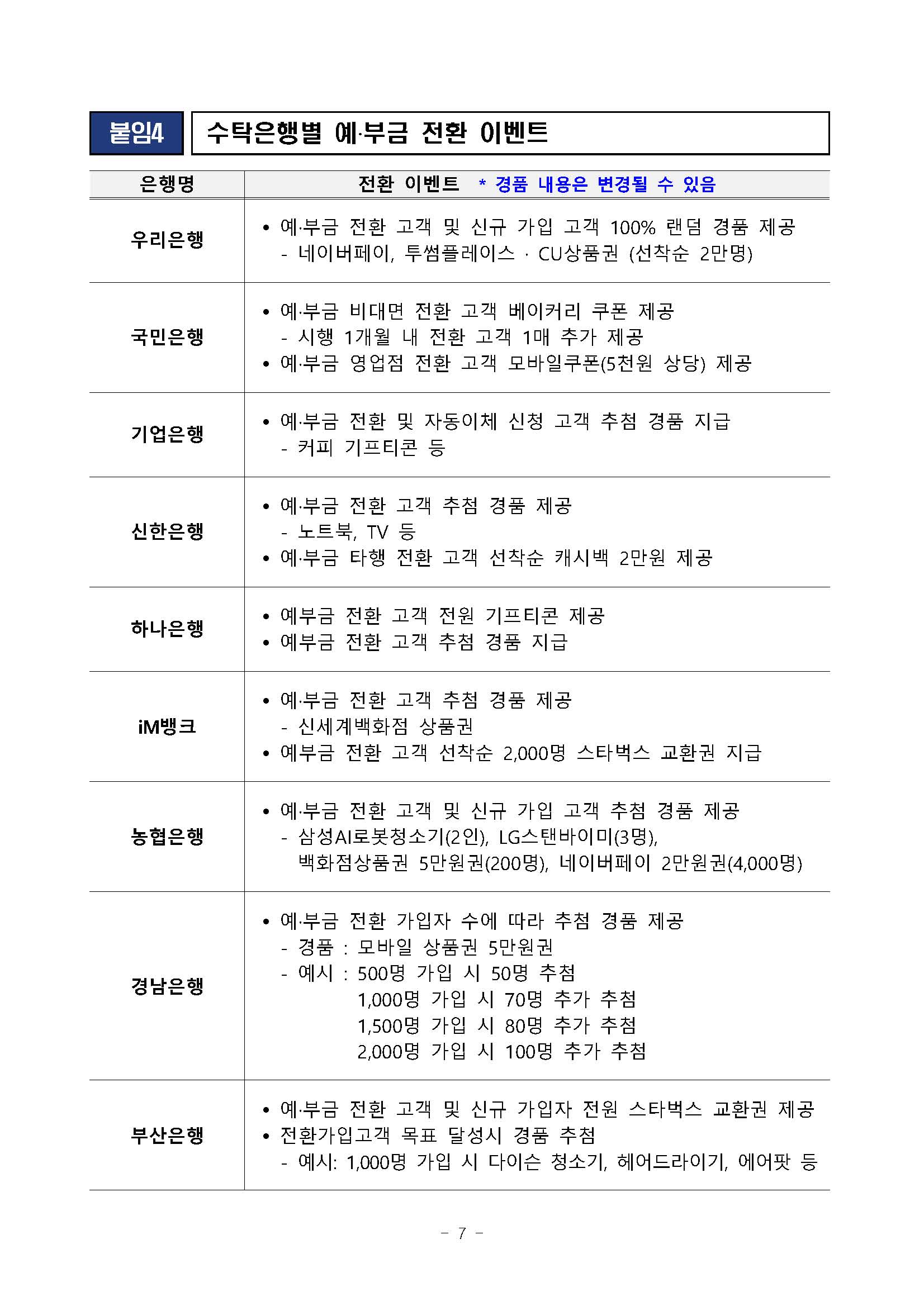 각 은행별 예·부금 전환이 가능하기 때문에 각 은행별 경쟁이 치열할 것 같네요. 그래서인지 전환 이벤트로 아래와 같이 경품을 제시하고 있습니다. 아무래도 주 거래 은행을 이용하는 것이 좋겠지만, 딱히 주 거래 은행이 없다면 아래 경품 내용을 참가하여 전환을 검토해 보는 것도 좋을 것 같아요.