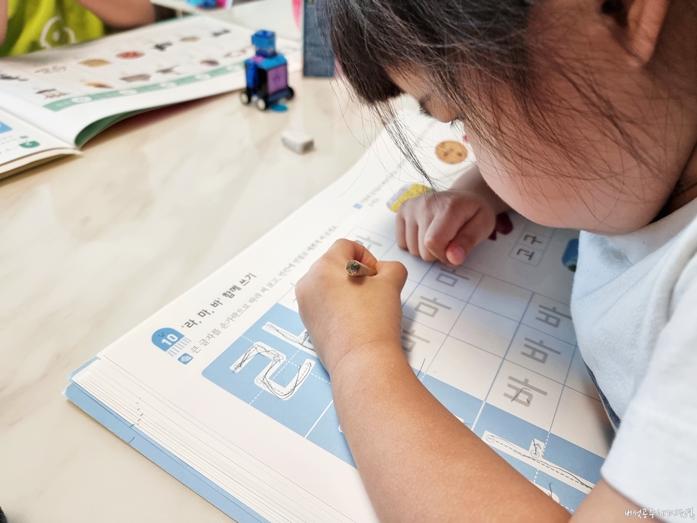 6살인 오빠가 한글 공부를 하고 있으면 4살 딸도 쪼르르 와서 한글 공부 책을 펼치더라구요. 확실히 첫째 오빠의 영향이 있나 봅니다.